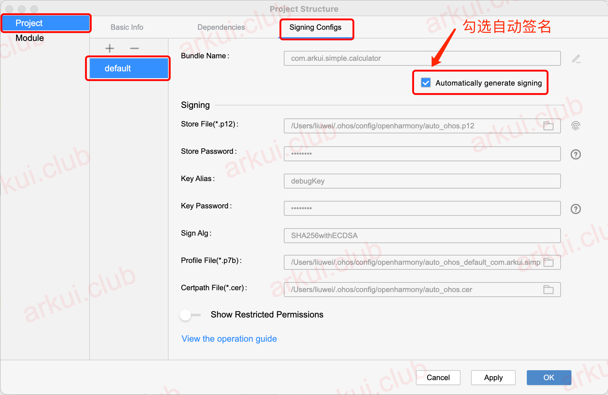 在 Project Structure 页面选择 Project,然后在 Signing Configs 界面勾选 Automatically generate signing,等待自动签名完成即可,点击 OK,如下图所示: