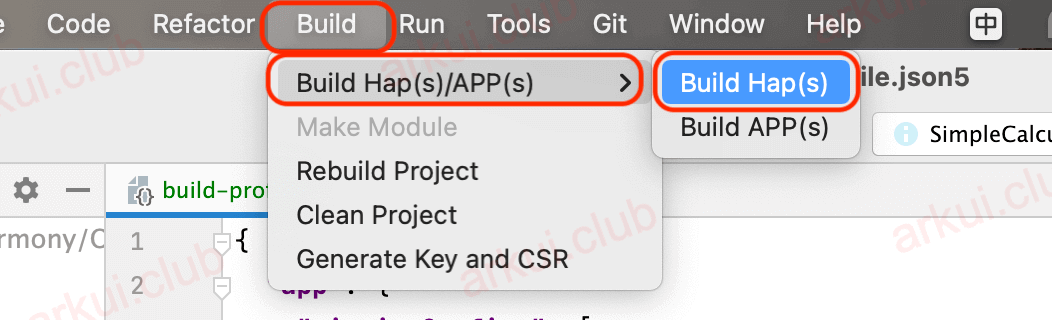 执行清理操作后,就可以打 Hap 包了,选择 Build Hap(s)/APP(s) > Build Hap(s),如下所示: